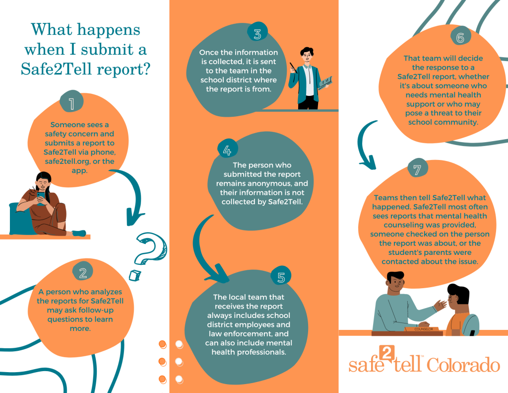 Anyone who has information about a potentially dangerous situation can call the toll-free, state-wide number at 1-877-542-7233, make a web report by clicking the Make a Report button at the top and side of the page, by downloading the mobile app and making a report from a smartphone, or by texting S2TCO to 738477. A trained Safe2Tell analyst will then forward the information to local teams consisting of schools, law enforcement, mental health, and/or other partners. Local partners have full authority over report response and outcomes.